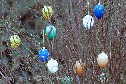 Ostern: Leere bunt bemalte Eier schaukeln im Frühlingswind. (*)